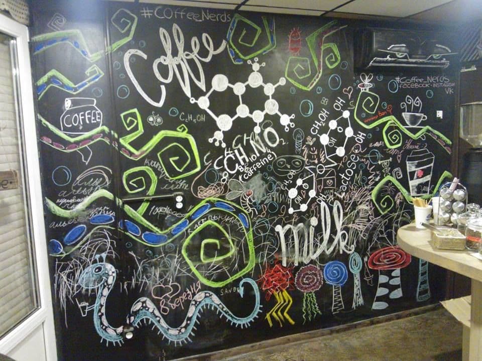 Разработка и реализация интерьера Coffee Nerds выполнялась собственными силами. Поскольку у каждого совладельца было собственное представление об идеальном кафе, соответственно и помещения были визуально разделены на две части, в том числе оформлены в черных и светло-коричневых тонах. Интересно смотрится та часть, которая декорирована натуральным деревом. Она предназначена для размещения картин. Необычным решением по черным панелям удивляет, поскольку на них посетители могут рисовать картины. С этой целью подготовлены специальные мелки разного цвета.