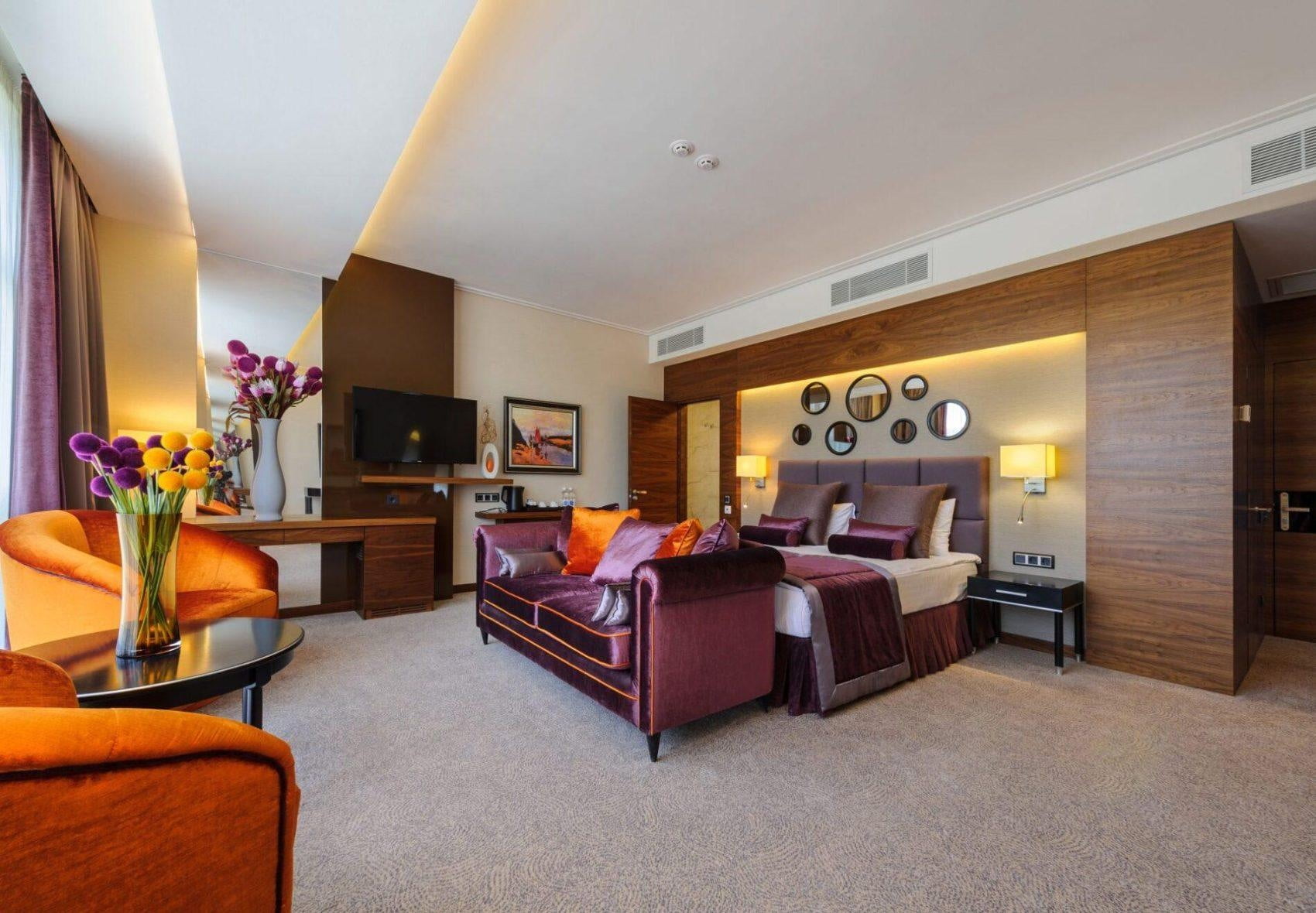 Гости могут остаться на одну или несколько ночей в гостиничном комплексе, который насчитывает сотни номеров различных категорий — от стандартных до просторных апартаментов. Номера отличаются современным дизайном, панорамными окнами и комфортными условиями для отдыха.