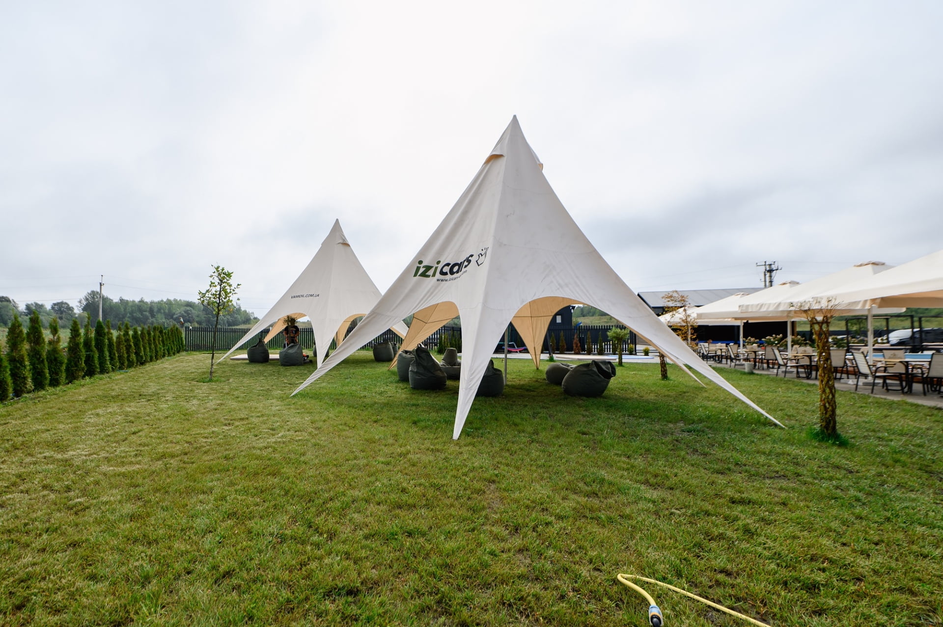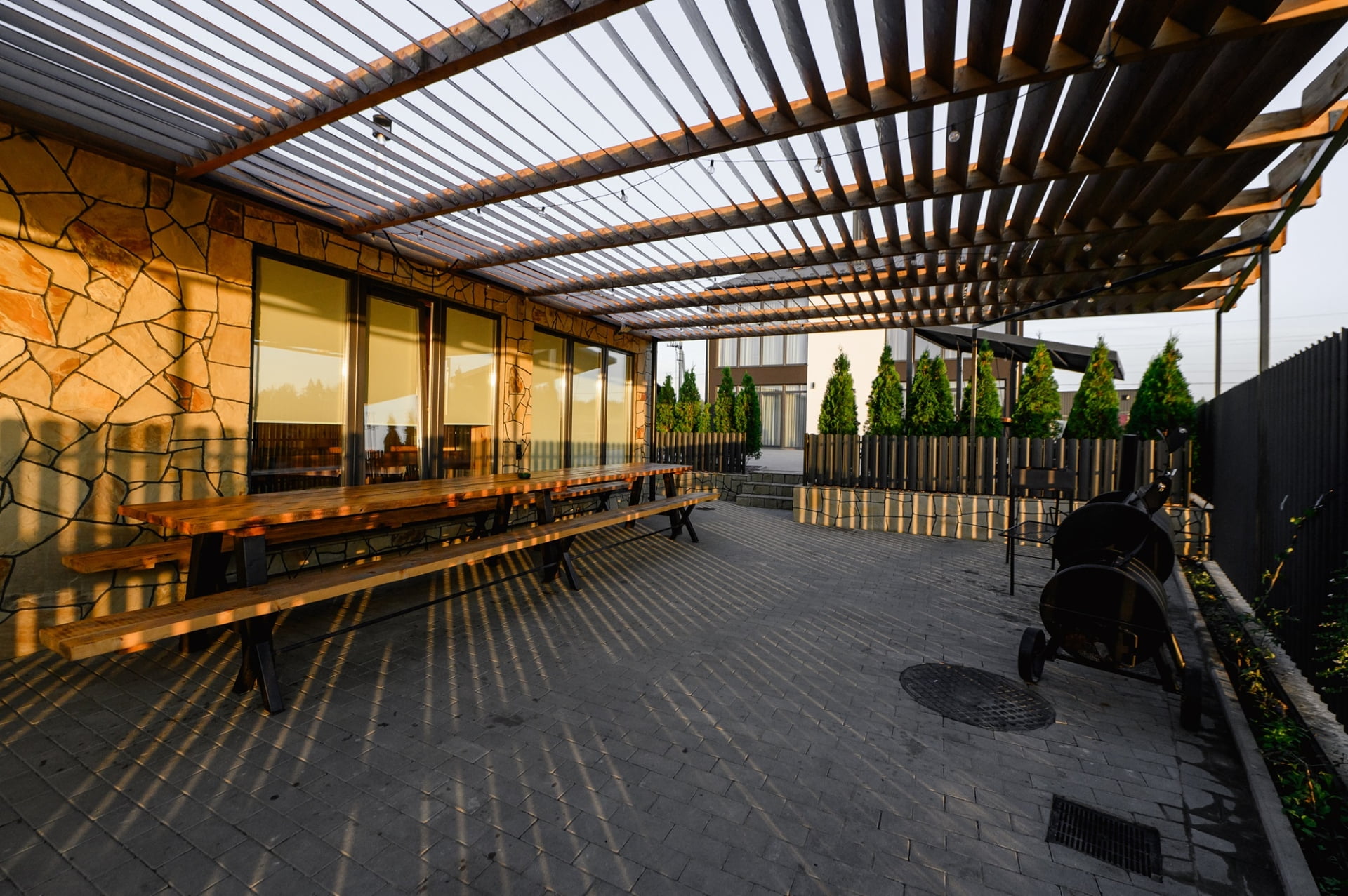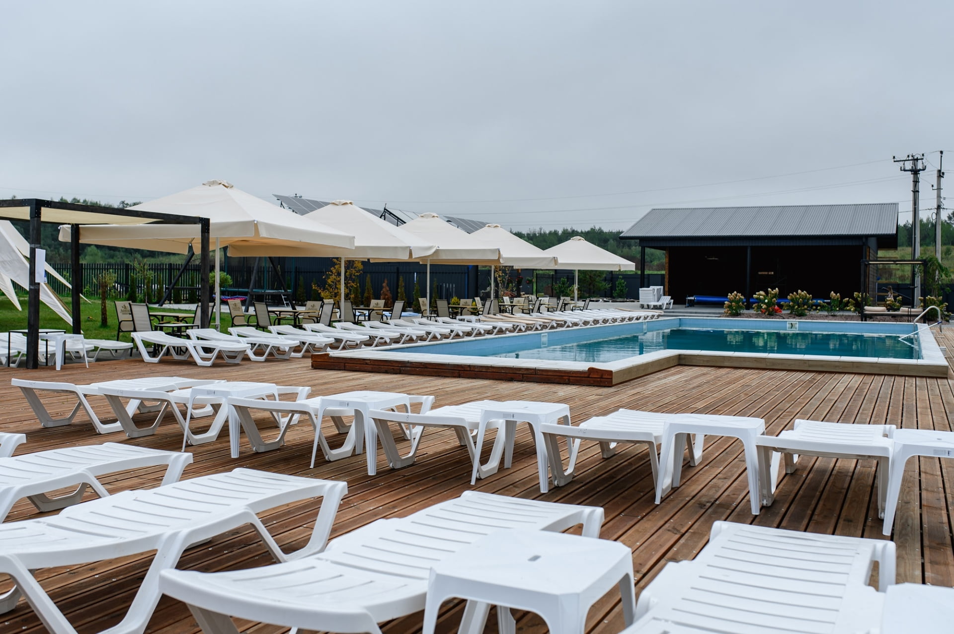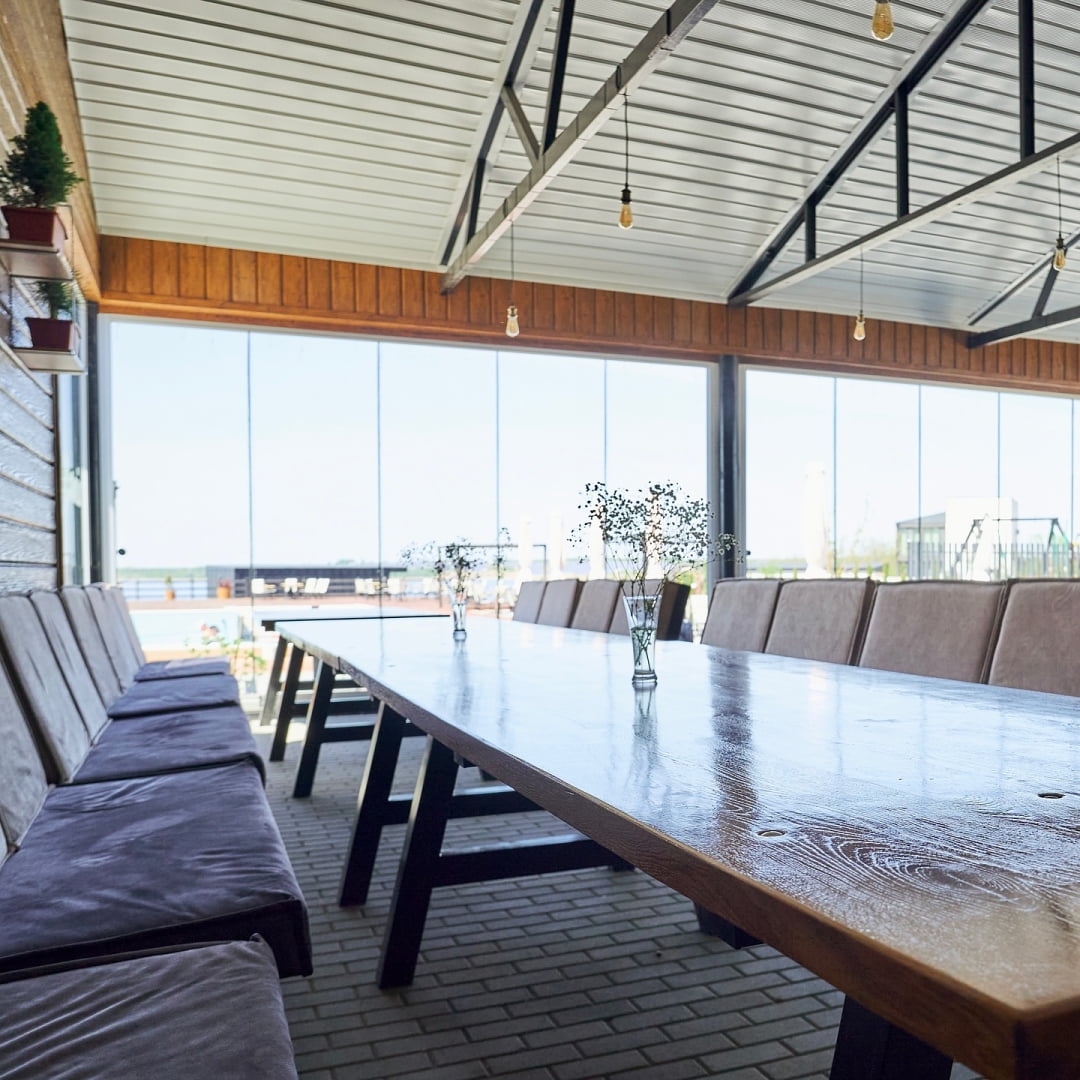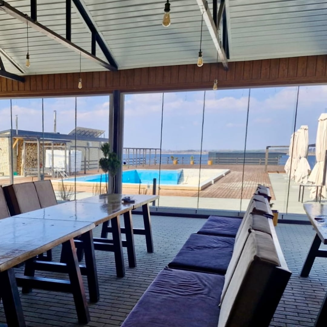 На территории комплекса работает ресторан, который обслуживает праздничные события в банкетном зале на 70-80 человек. Это прекрасное место для свадьбы, дня рождения или корпоративной вечеринки. Также в сезон у бассейна действует бар с напитками и легкими закусками. В то же время гости, которые останавливаются в коттеджах или гостиничных номерах, могут самостоятельно готовить еду на мини-кухне, оборудованной всем необходимым. Доступна и опция заказа завтраков.