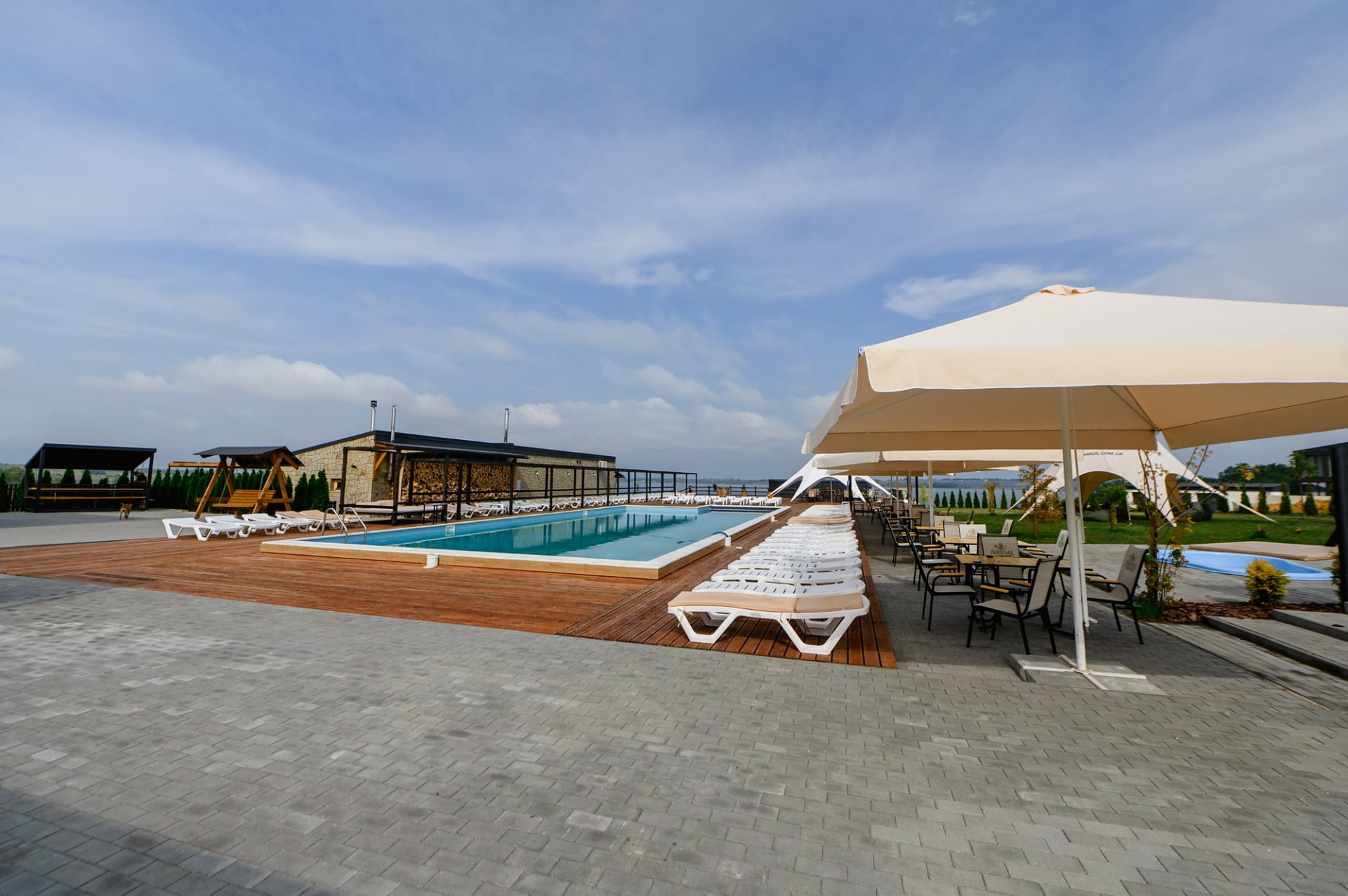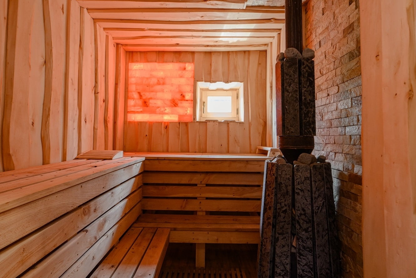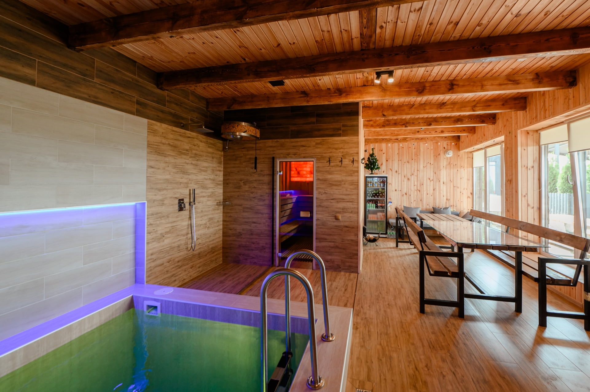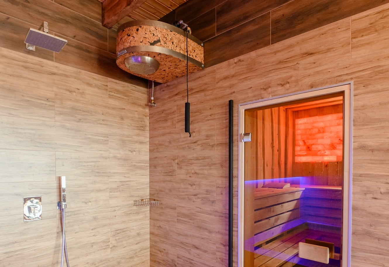 Для любителей спа-отдыха предусмотрена баня на дровах с соляными лампами, холодный бассейн, джакузи и плавучий бассейн с подогревом и волной.