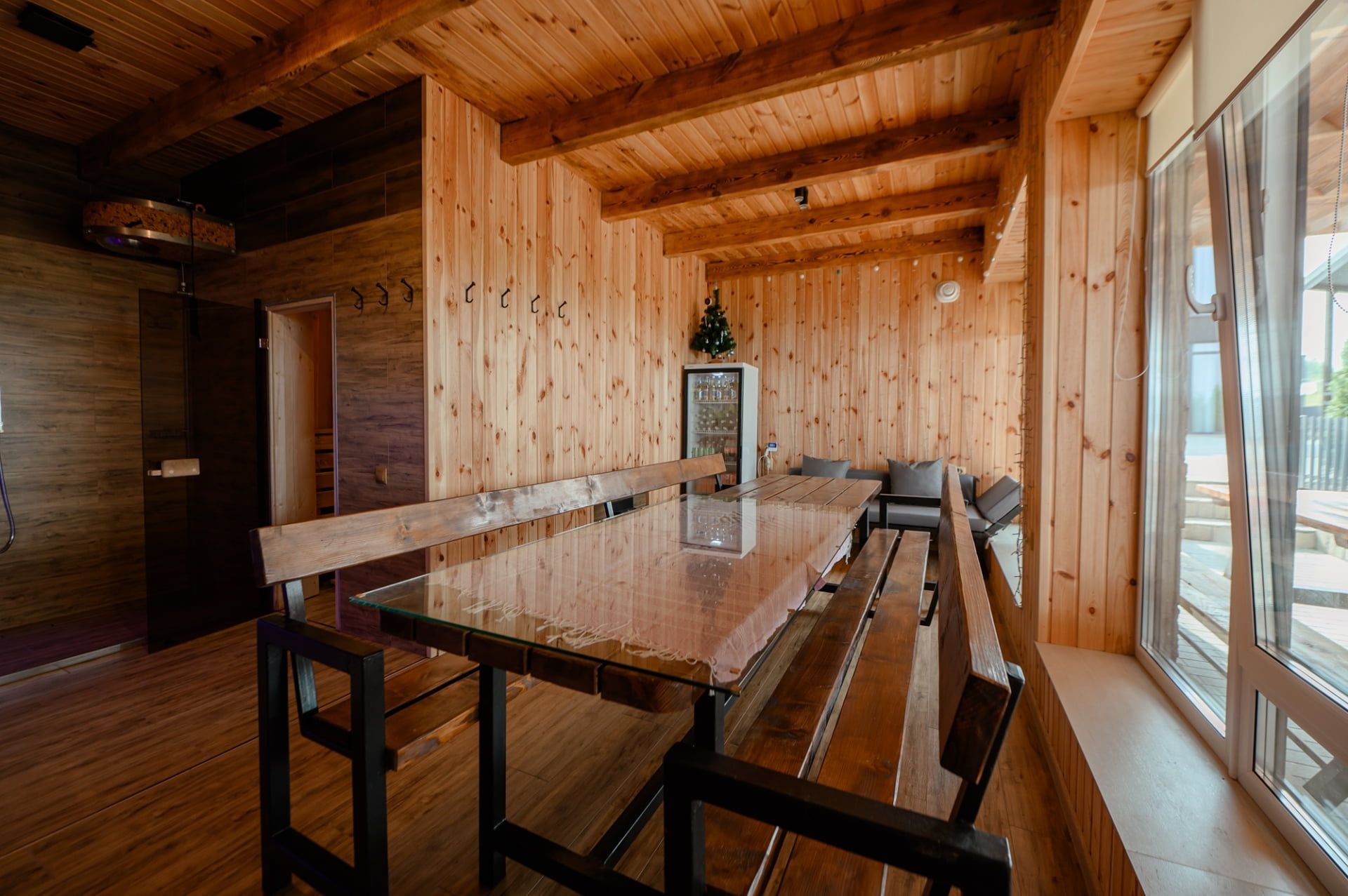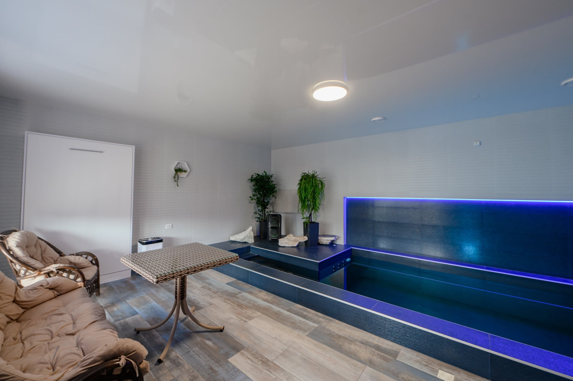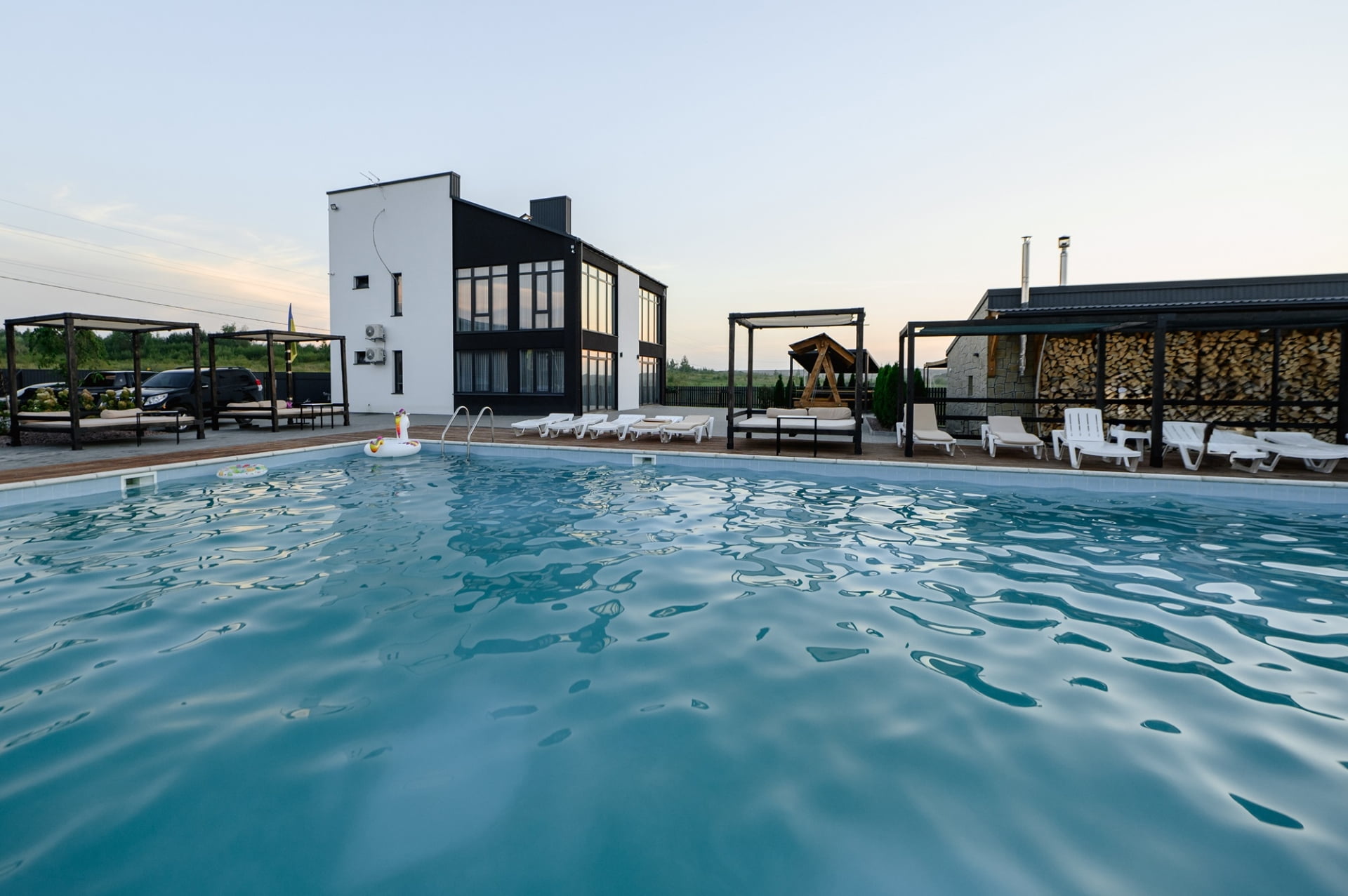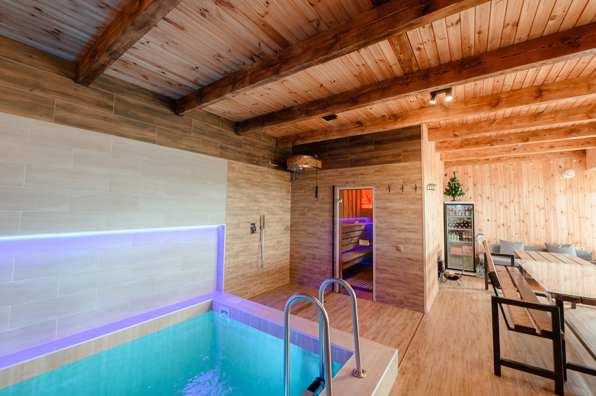 Для любителей спа-отдыха предусмотрена баня на дровах с соляными лампами, холодный бассейн, джакузи и плавучий бассейн с подогревом и волной.