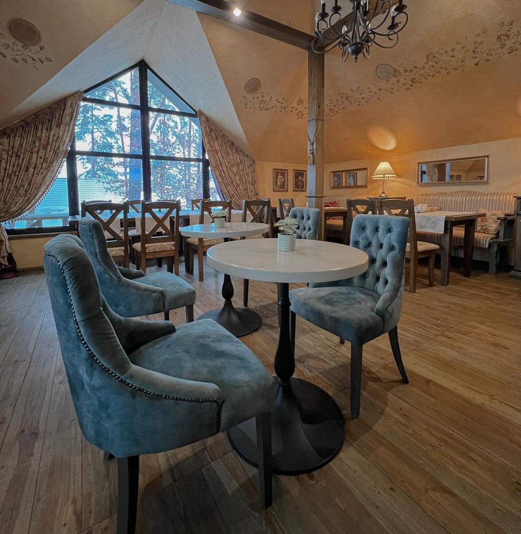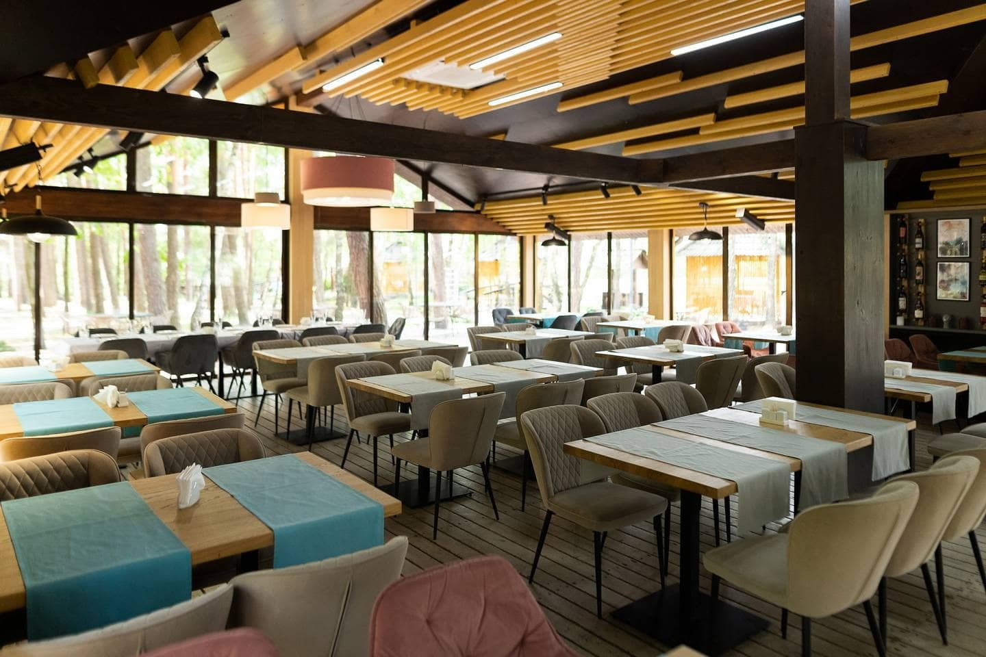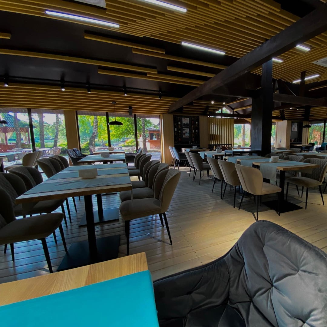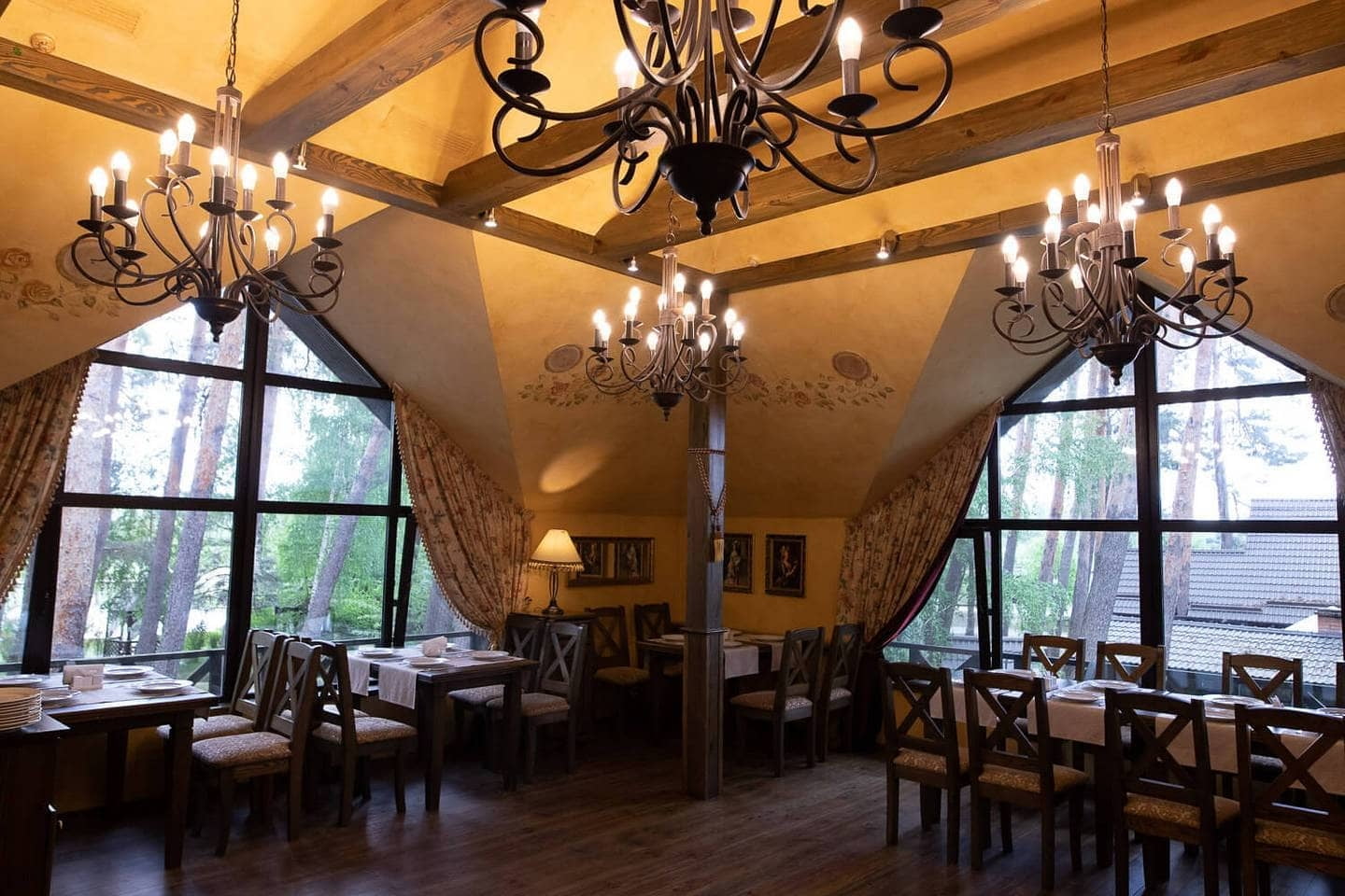 | Кухня | рестораны европейской кухни с полесскими акцентами, банкетные залы, живая музыка, панорамный ресторан, колибы, беседки у озера |