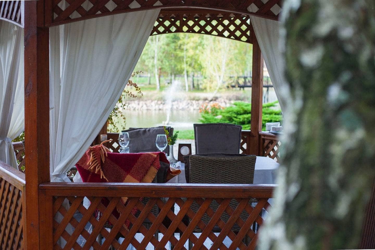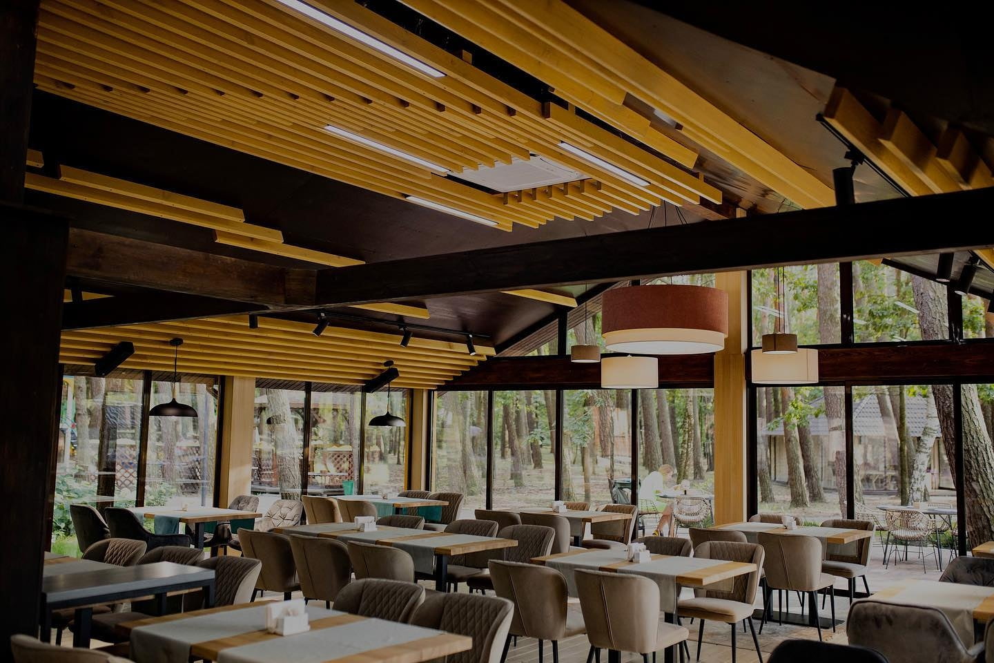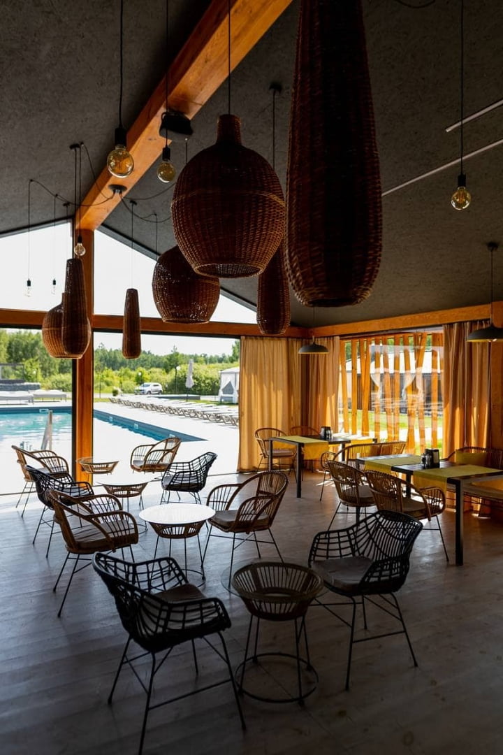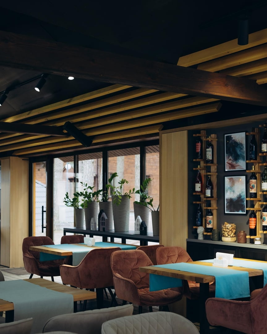 | Кухня | рестораны европейской кухни с полесскими акцентами, банкетные залы, живая музыка, панорамный ресторан, колибы, беседки у озера |