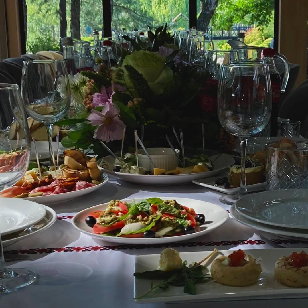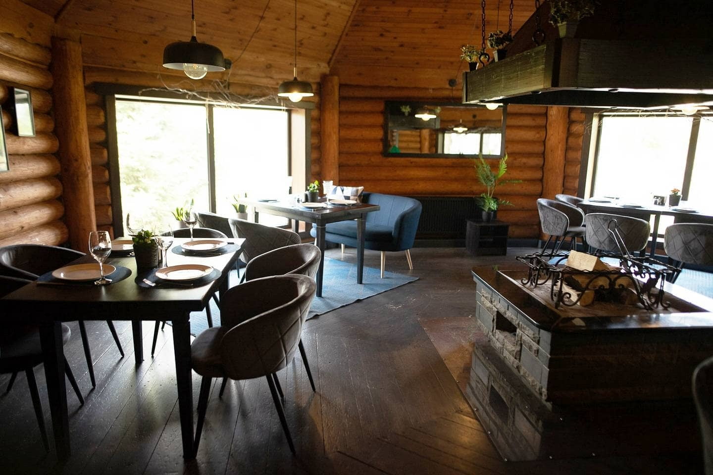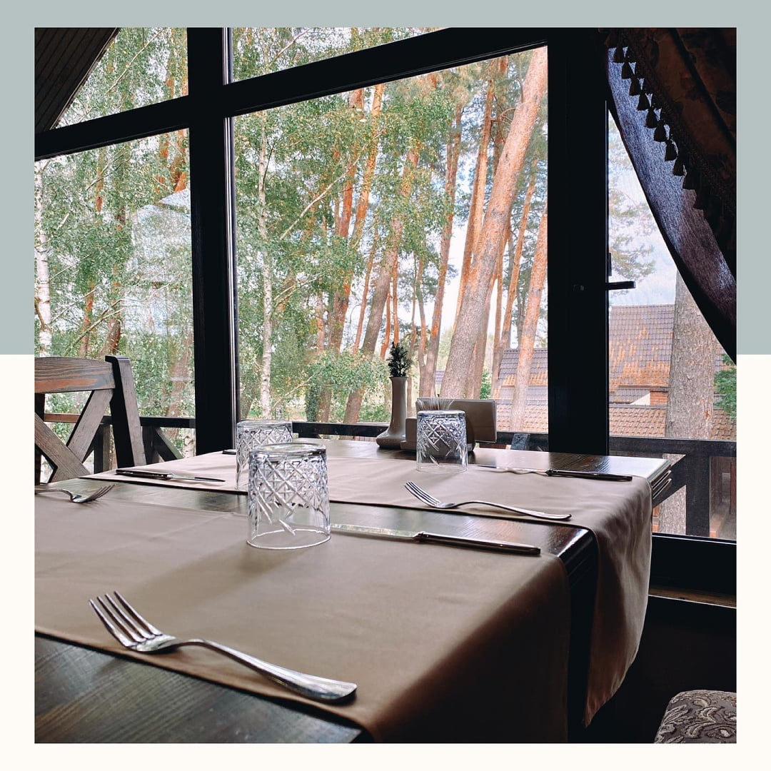 На территории комплекса работает ресторан европейской кухни с полесскими акцентами, где готовят из свежих местных продуктов. Гости могут наслаждаться блюдами в нескольких локациях — панорамном ресторане, классическом зале на «высоте» или в колибах у озера. Есть возможность проведения банкетов, свадеб, корпоративов и частных праздников с живой музыкой и профессиональным сервисом. Также можно заказать доставку блюд в номер.