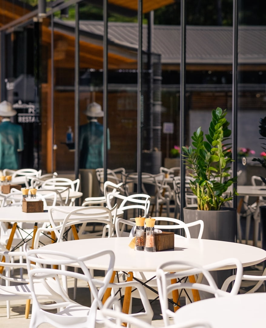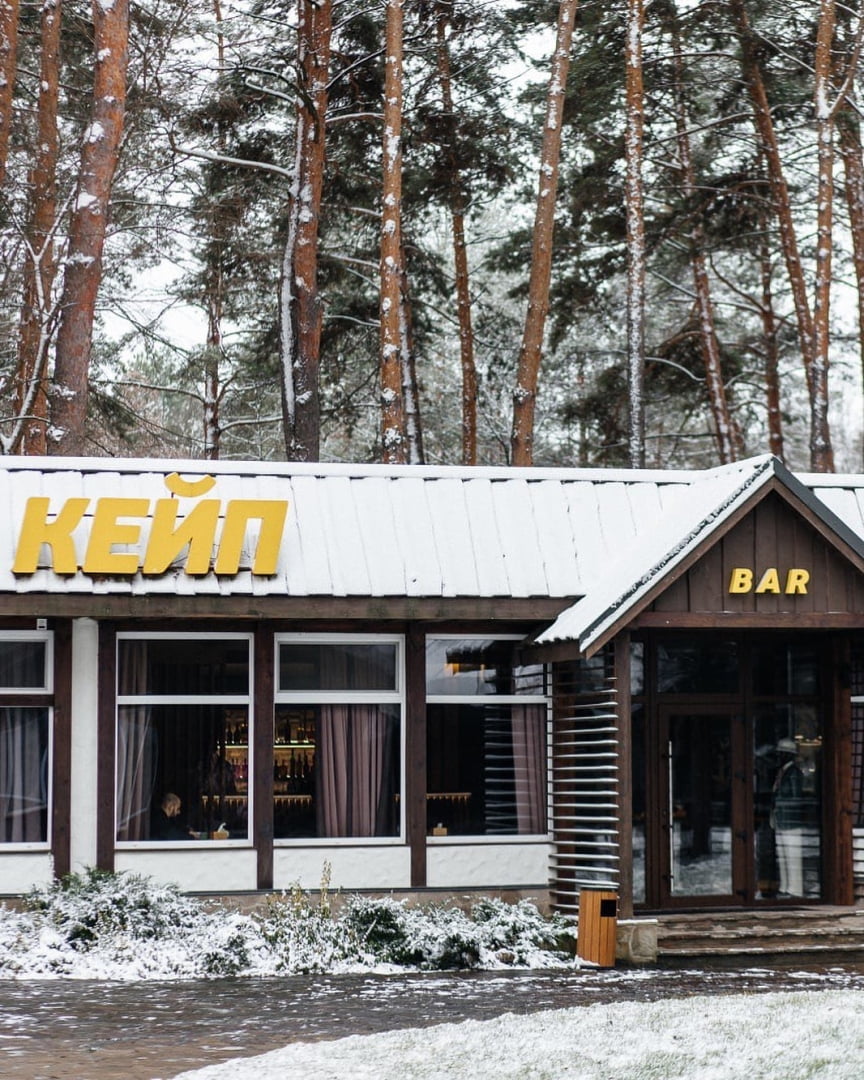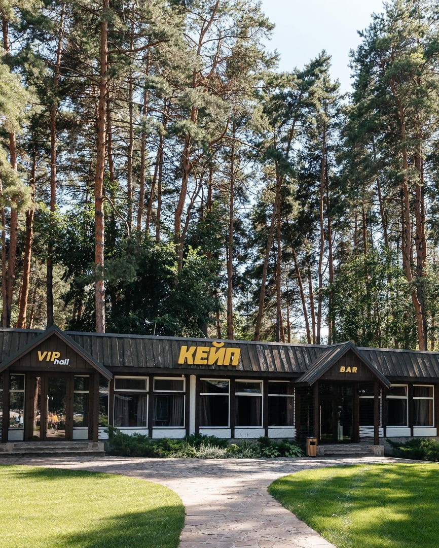 На территории комплекса работает несколько заведений питания. Ресторан «Кейп» предлагает блюда украинской и европейской кухни. В летний сезон открываются пляжные и барные локации с легкими блюдами, напитками и коктейлями. Для мероприятий и праздников доступны банкетные залы с видом на природу, которые подходят для свадеб, корпоративов и семейных торжеств. Часть форматов предусматривает комплексное питание для гостей, проживающих в комплексе.