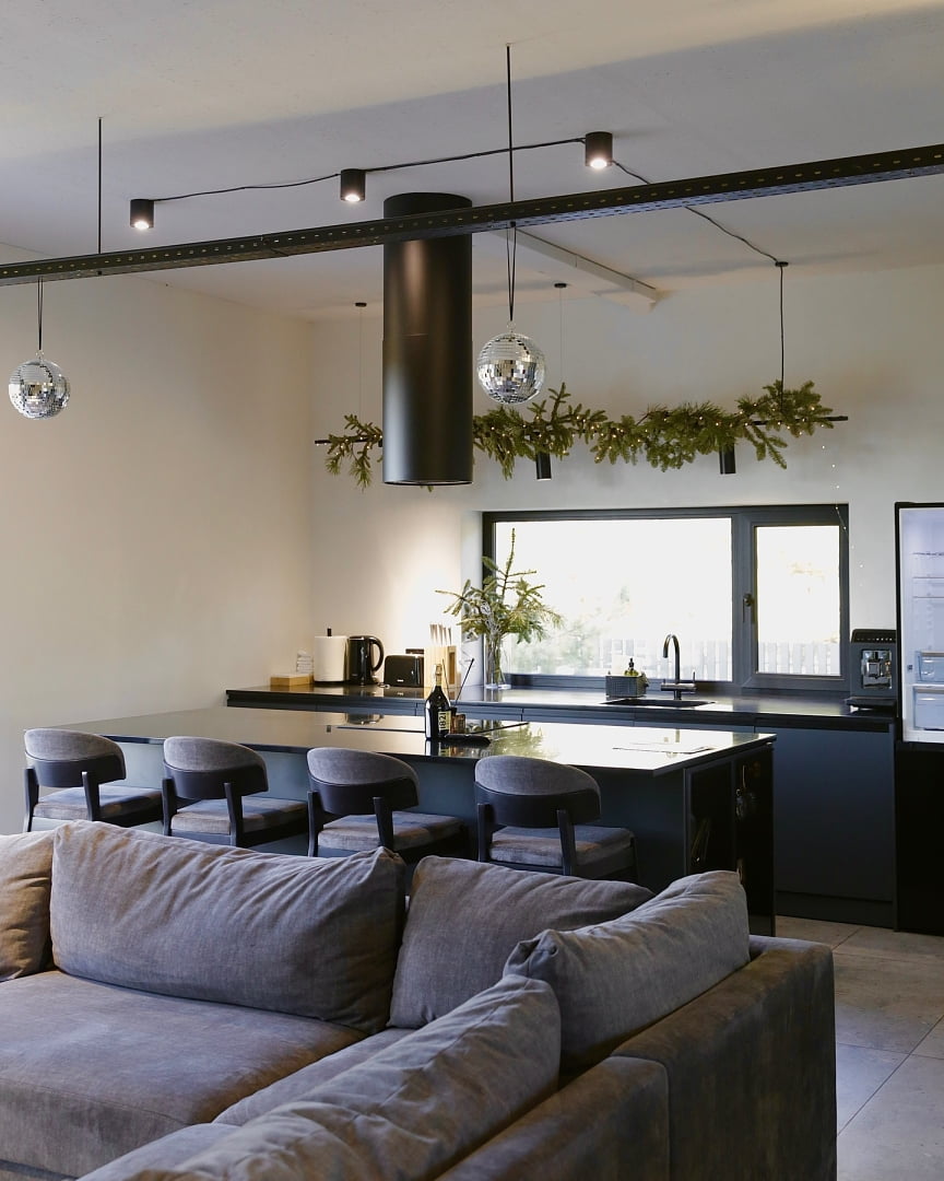 - Просторная общая комната с большим модульным диваном и кухонной зоной.