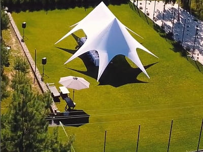 - Мини-футбольное и волейбольное поле, а также детская площадка, батут и горка для самых маленьких гостей.