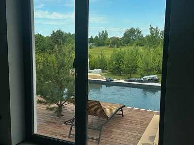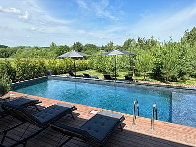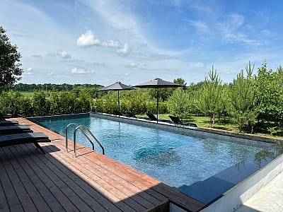 - Бассейн с подогревом и комфортными шезлонгами для солнечных ванн.