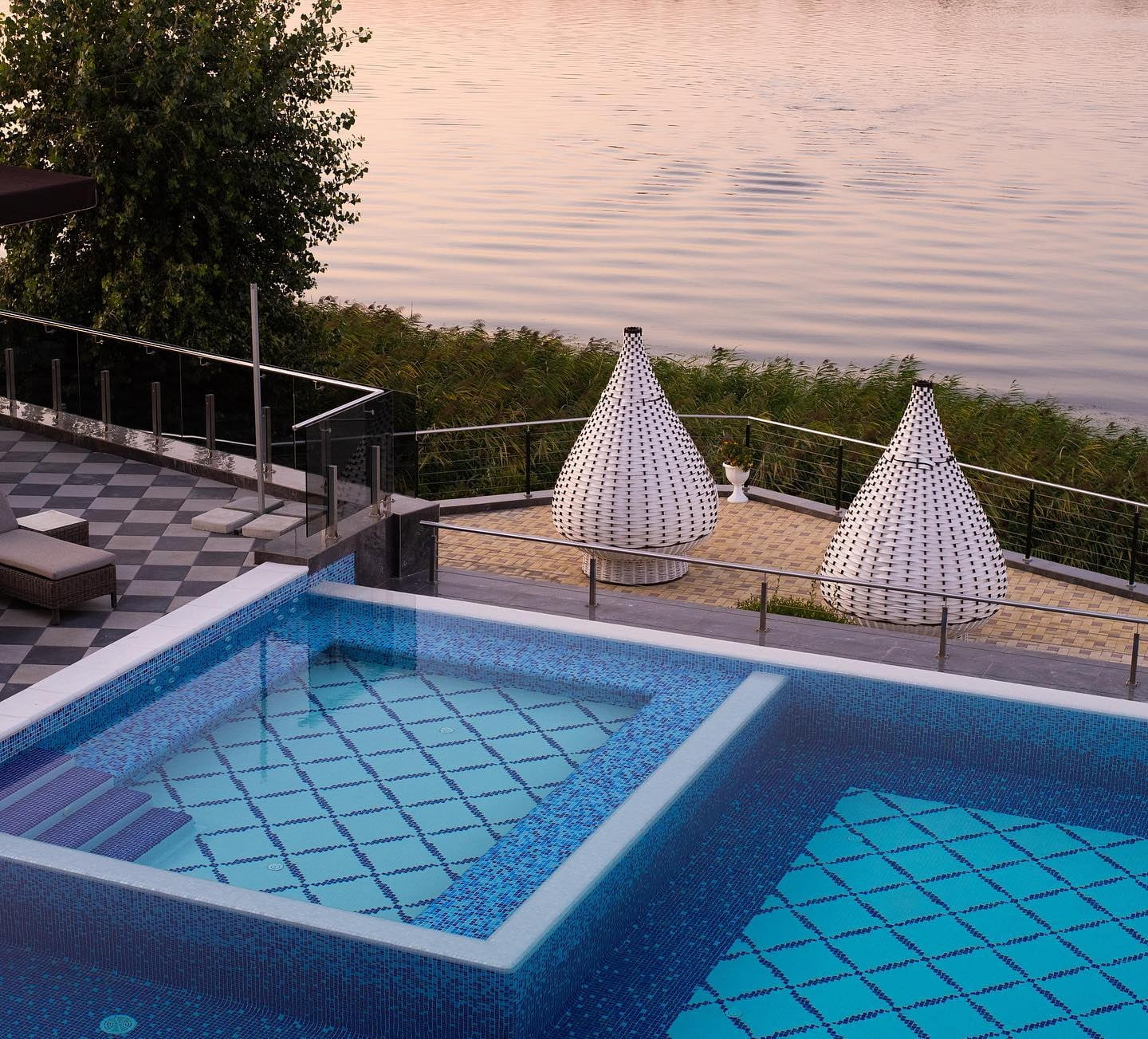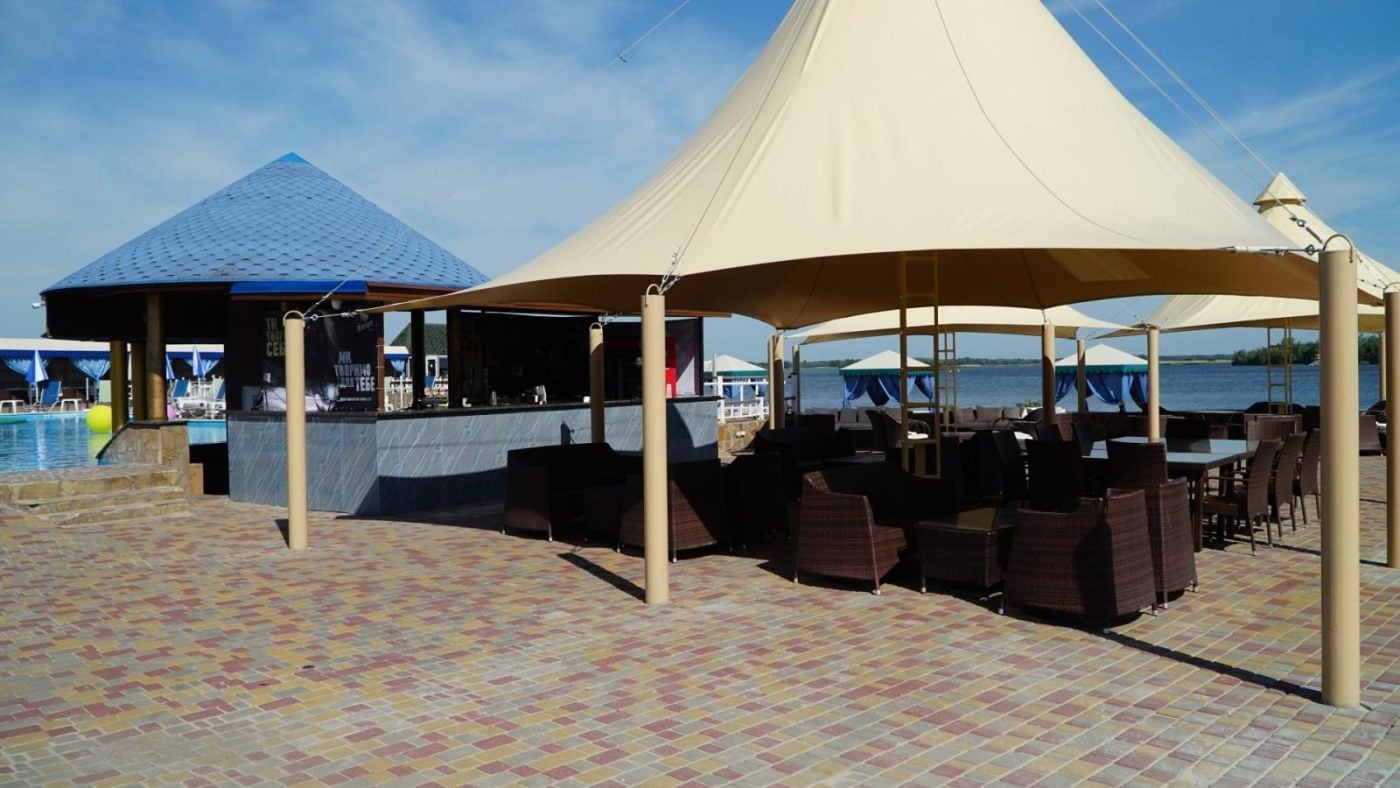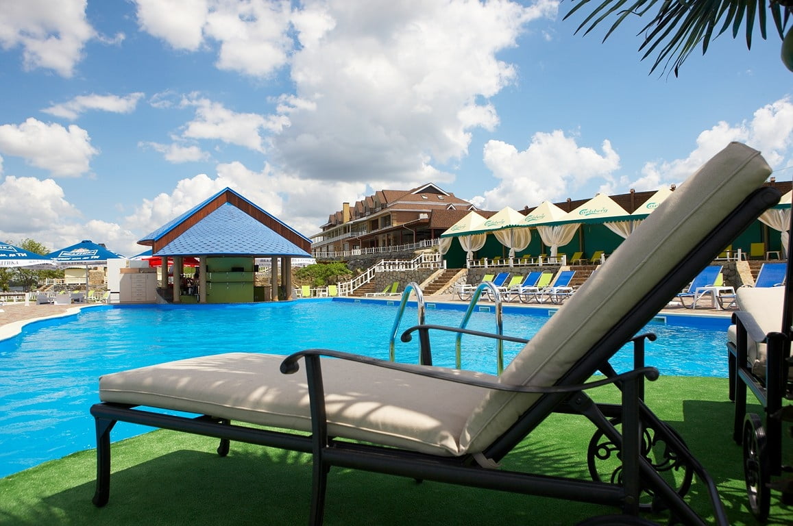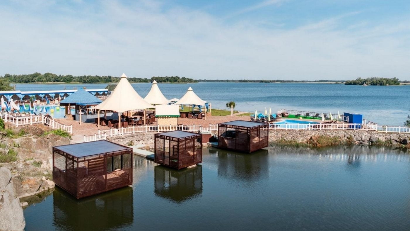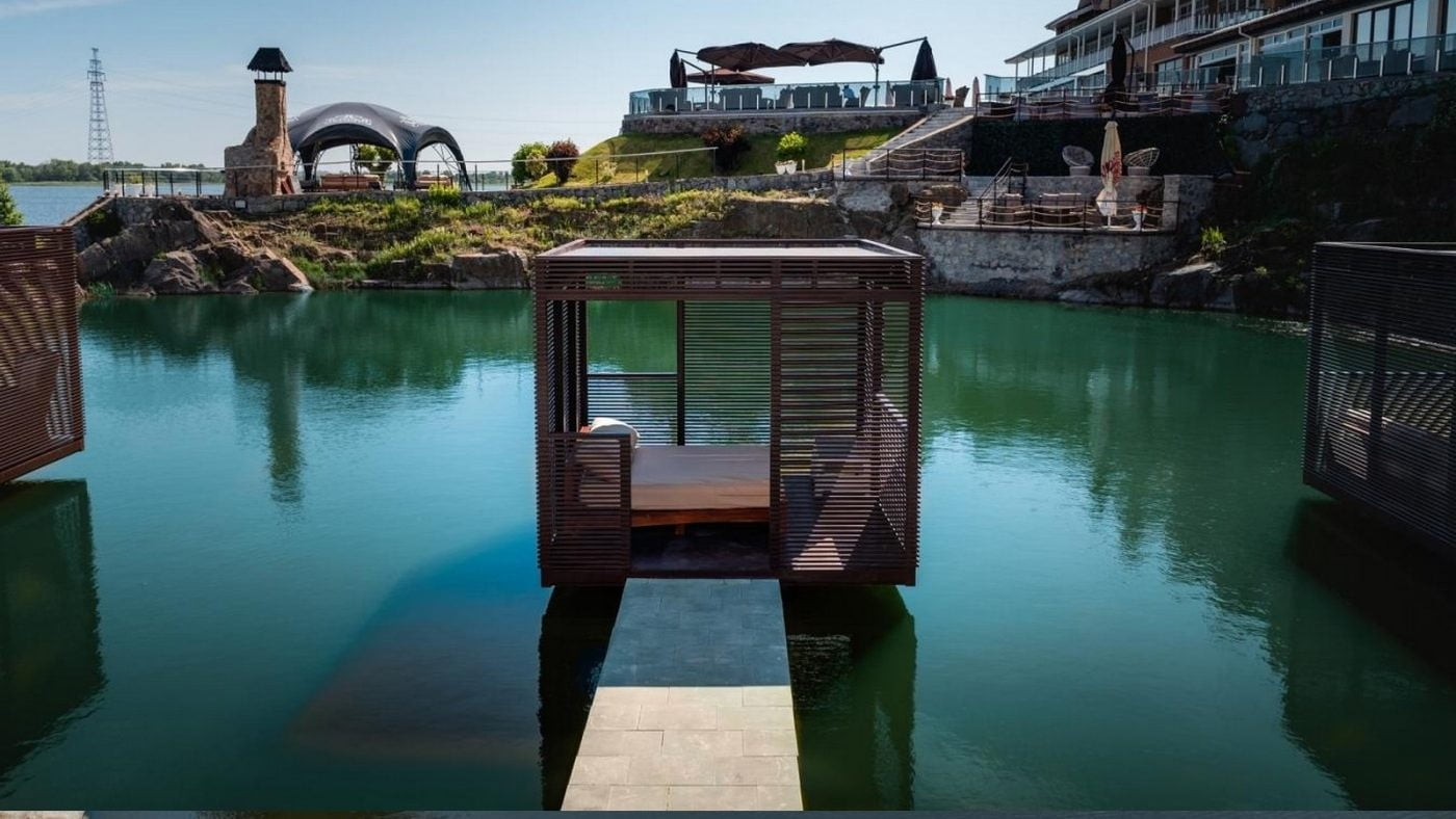 Для ценителей отдыха под открытым небом обустроена верхняя терраса с двумя открытыми бассейнами с подогревом, лаунж-зонами и панорамным видом на Днепр. В теплый сезон функционирует аква-зона у воды с зонами спокойного релакса.