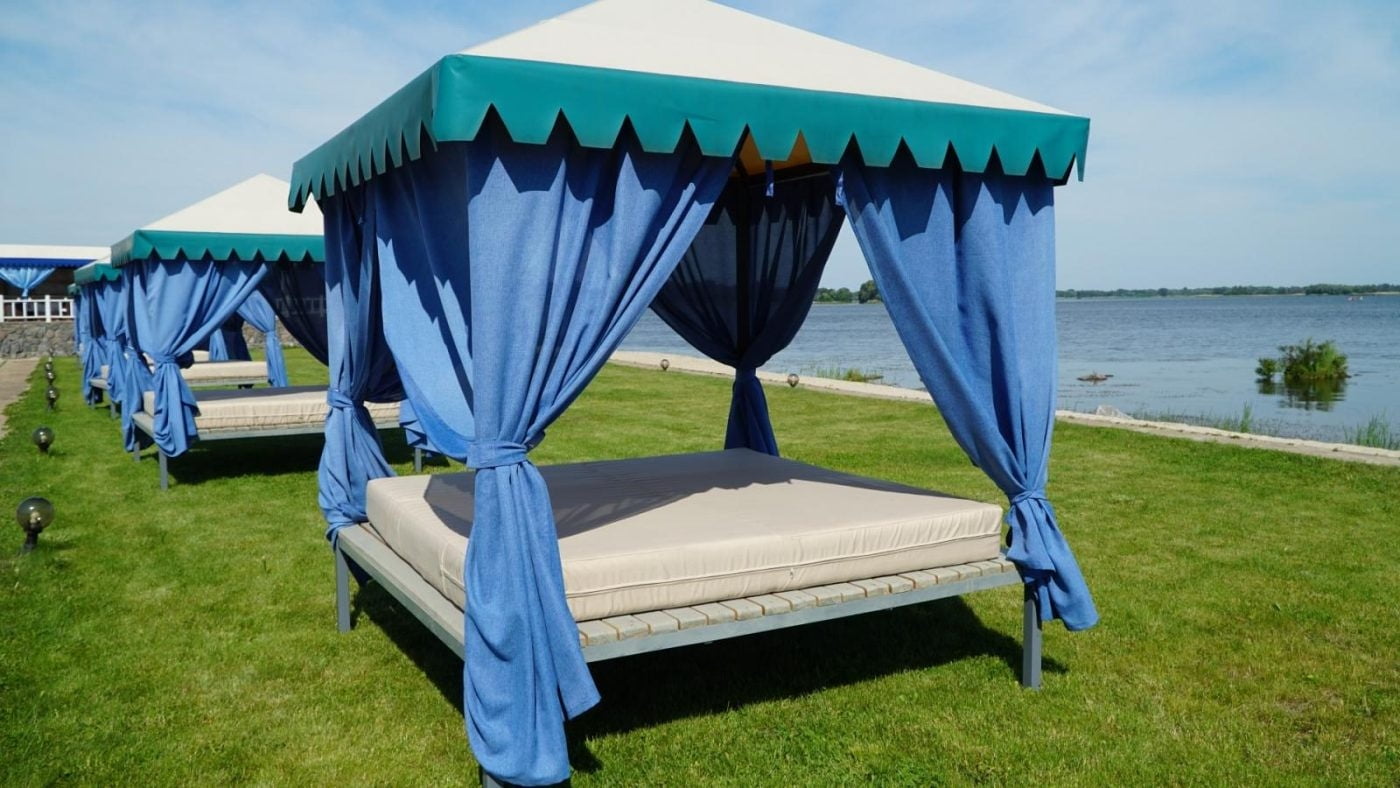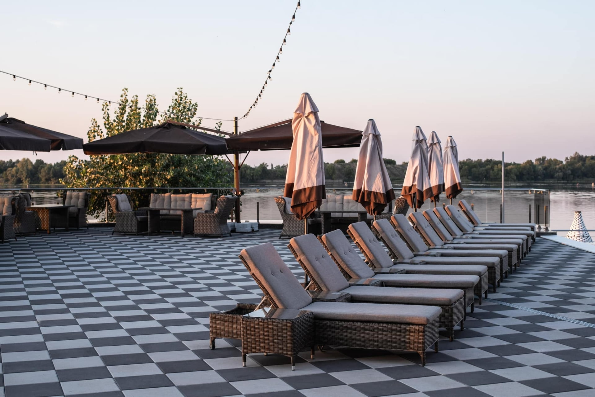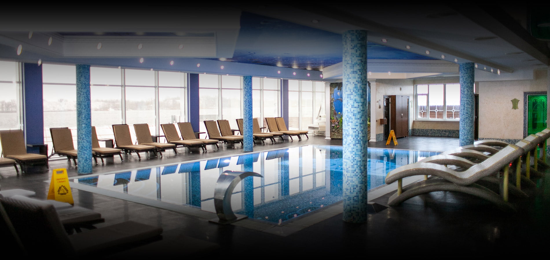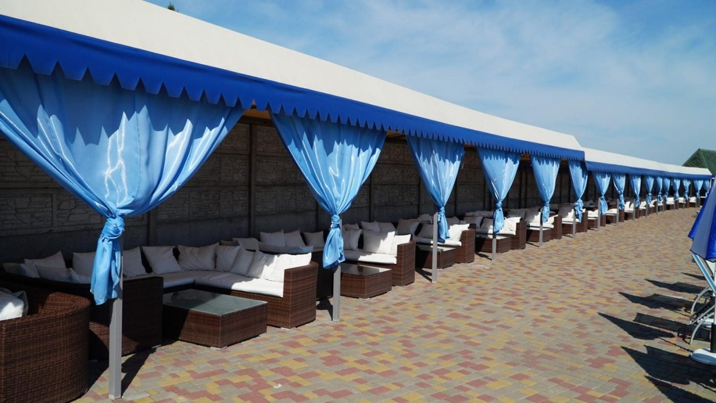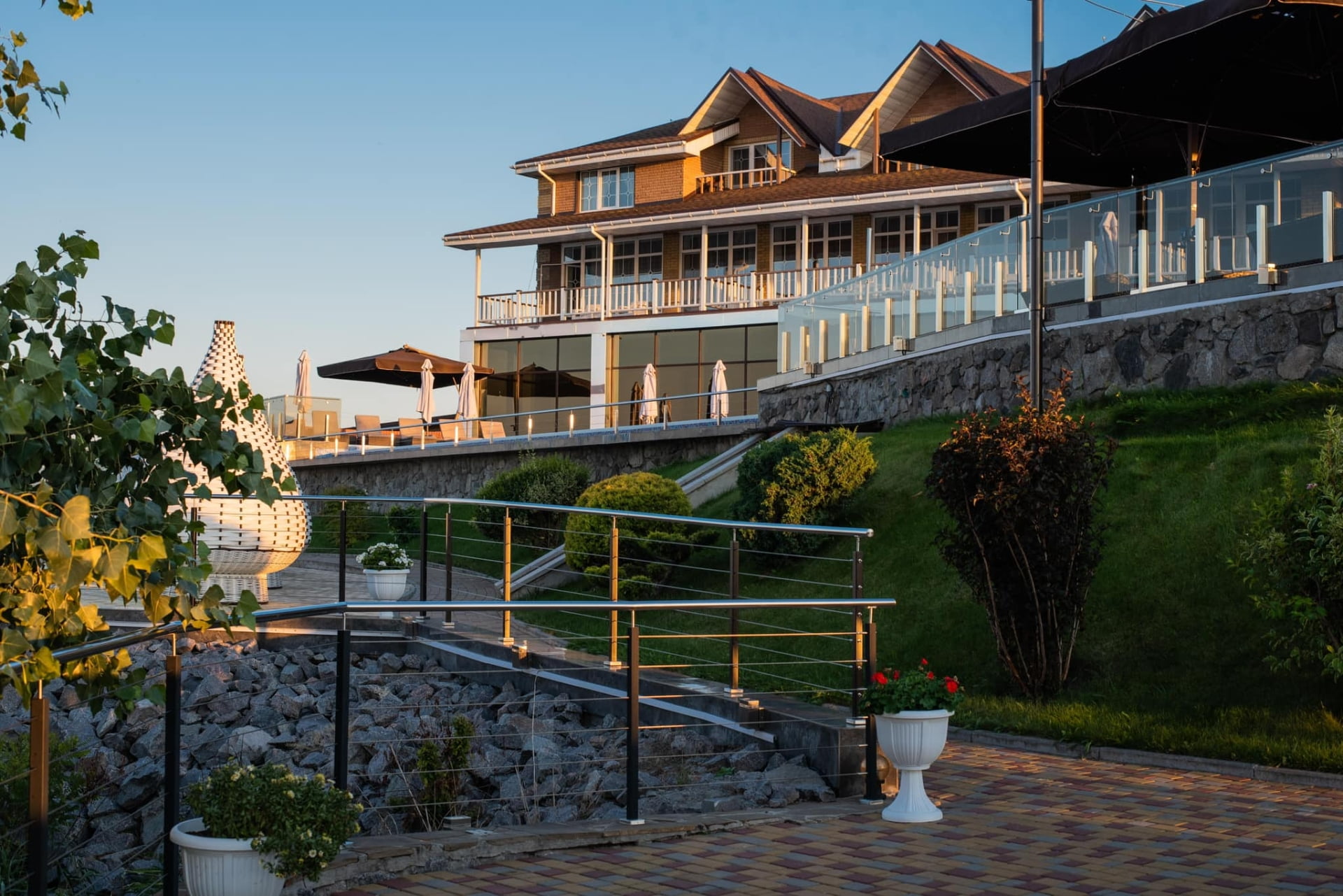 Для ценителей отдыха под открытым небом обустроена верхняя терраса с двумя открытыми бассейнами с подогревом, лаунж-зонами и панорамным видом на Днепр. В теплый сезон функционирует аква-зона у воды с зонами спокойного релакса.