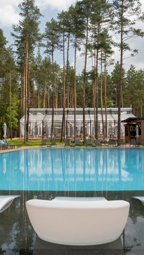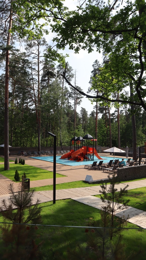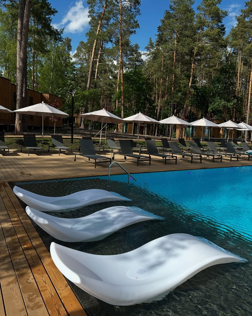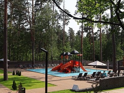 На территории работает большая зона релакса с двумя открытыми бассейнами с подогревом - один для взрослых, второй детский с водяными горками. Оба бассейна оснащены современной системой фильтрации. Для ценителей тепловых процедур действует банный комплекс на дровах с двумя зонами, где можно совместить отдых с наслаждением от панорамных видов.