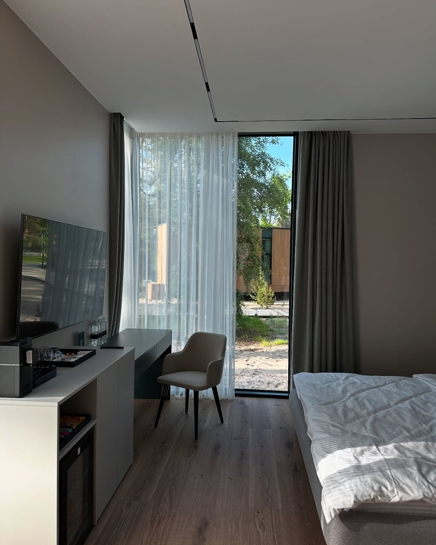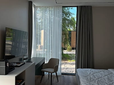 Гости могут выбрать из четырех типов коттеджей: от двухкомнатных уютных домиков до роскошных двухэтажных вариантов с собственными бассейнами и террасами. Все коттеджи построены из экологичных материалов и гармонично вписаны в лесной ландшафт. Они оборудованы кондиционерами, кофемашинами, Wi-Fi, уличной мебелью и другими удобствами. Особой популярностью пользуются коттеджи Family Premium Pool, идеально подходящие для большой семьи или компании друзей.