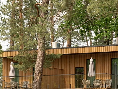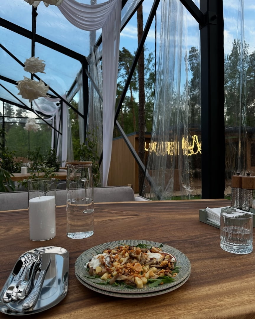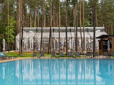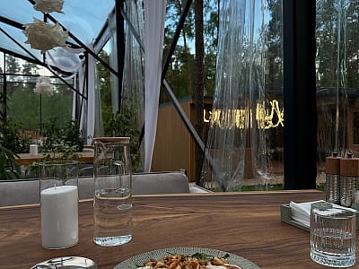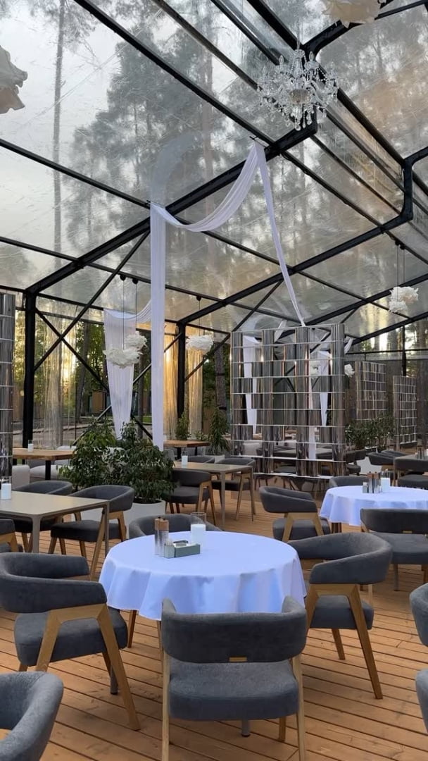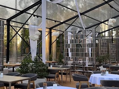 Для проведения масштабных событий или семейных торжеств обустроен «Прозрачный зал» - современное пространство, сочетающее уют закрытого помещения с естественной атмосферой леса. Зал адаптируется к различным форматам мероприятий и оборудован всем необходимым для комфорта гостей.