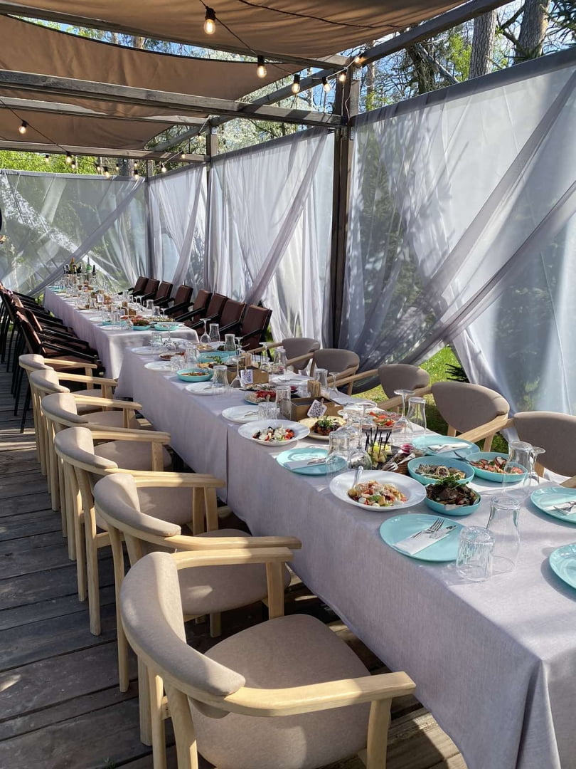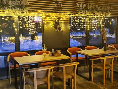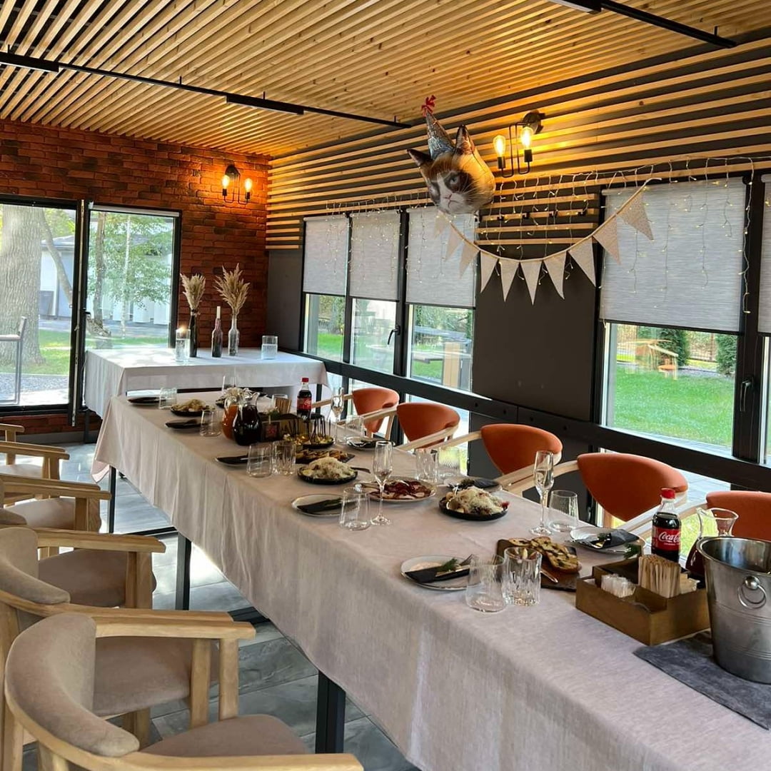 На территории комплекса работает ресторан, где подают блюда, соответствующие концепции семейного отдыха. Меню адаптировано для взрослых и детей, а также предусматривает доставку еды в коттеджи. Для гостей, которые предпочитают самостоятельное приготовление, в коттеджах есть оборудованная кухня. Комплекс также предлагает организацию праздничных событий в уютной атмосфере с профессиональным обслуживанием.