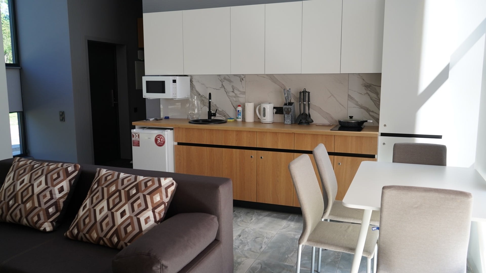 Гости могут остановиться в современных коттеджах, рассчитанных на 4-5 человек. Каждый коттедж обустроен всем необходимым: отдельная спальня, ванная комната, кухня со всеми удобствами, обеденная зона и гостиная. Предусмотрено автономное отопление и кондиционирование. Для комфортного отдыха на свежем воздухе возле коттеджей есть мангалы и зоны для отдыха. Комплекс принимает гостей с домашними любимцами.