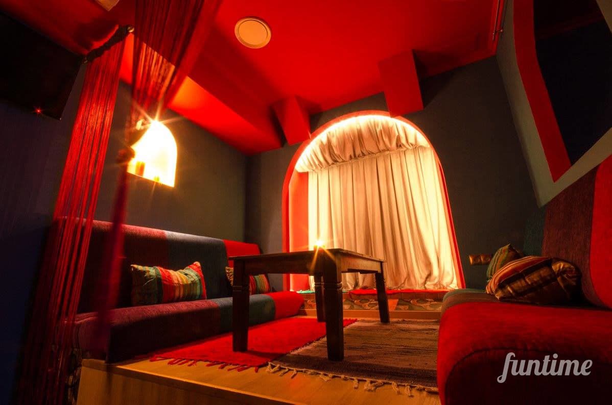 AbuDhabi разделена на два зала. В первом зале стоит несколько стандартных столов с диванами и креслами, похожими на шезлонги. Выглядят они весьма удобно. Но так как все места в этом зале были заняты, мы прошли во второй зал, и не пожалели. Помещение оформлено в восточном стиле: приглушенный свет, низкая мебель, расставленная на четырех подиумах, яркие цвета создают уют и ощущение восточной сказки. На одном из таких подиумов, мы и устроились. Диваны очень удобные. Благодаря тому, что они низкие на них можно и сидеть и лежать. В отличии от других кальянных, здесь не пытались поставить максимальное количество столов на квадратный метр. В результате, в кальянной очень просторно и можно разместится большой компанией. Например, во втором зале за одним столом спокойно сможет разместиться компания из восьми человек.