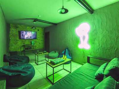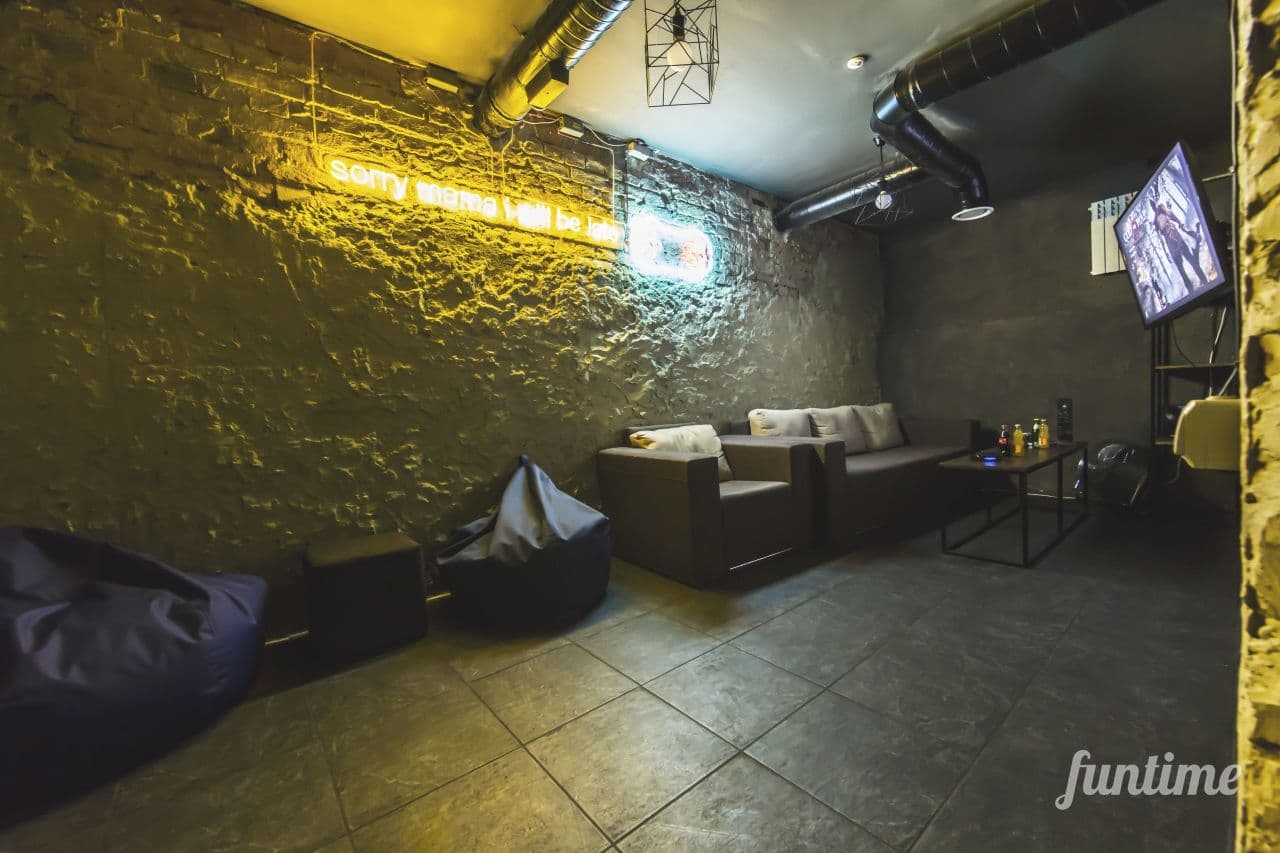 Для празднований и вечеринок можно арендовать комнаты. Всего есть пять комнат, в каждой из которых есть плазма на 55 дюймов и консоль Playstation4 с крутой аудиосистемой.