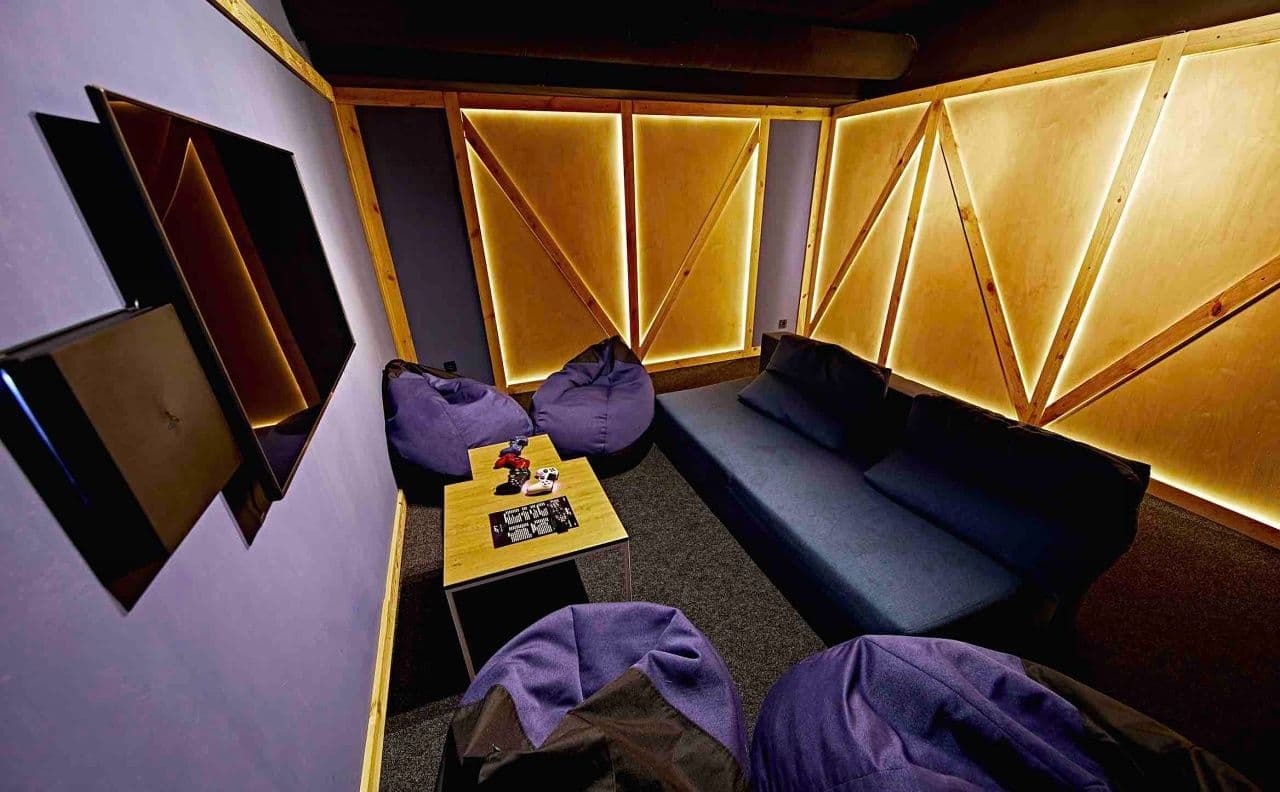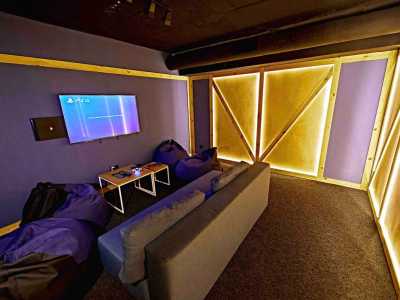 Зона отдыха представляет собою 5 отдельных помещений, оборудованных необходимой техникой и мебелью. Вместительность их разная, благодаря чему не сложно будет подобрать вариант для правильного «чила». В одном помещении одновременно могут пребывать до 15 гостей. Картотека Playstation достаточно велика, чтобы удовлетворить запросы и интересы заядлых игроков.