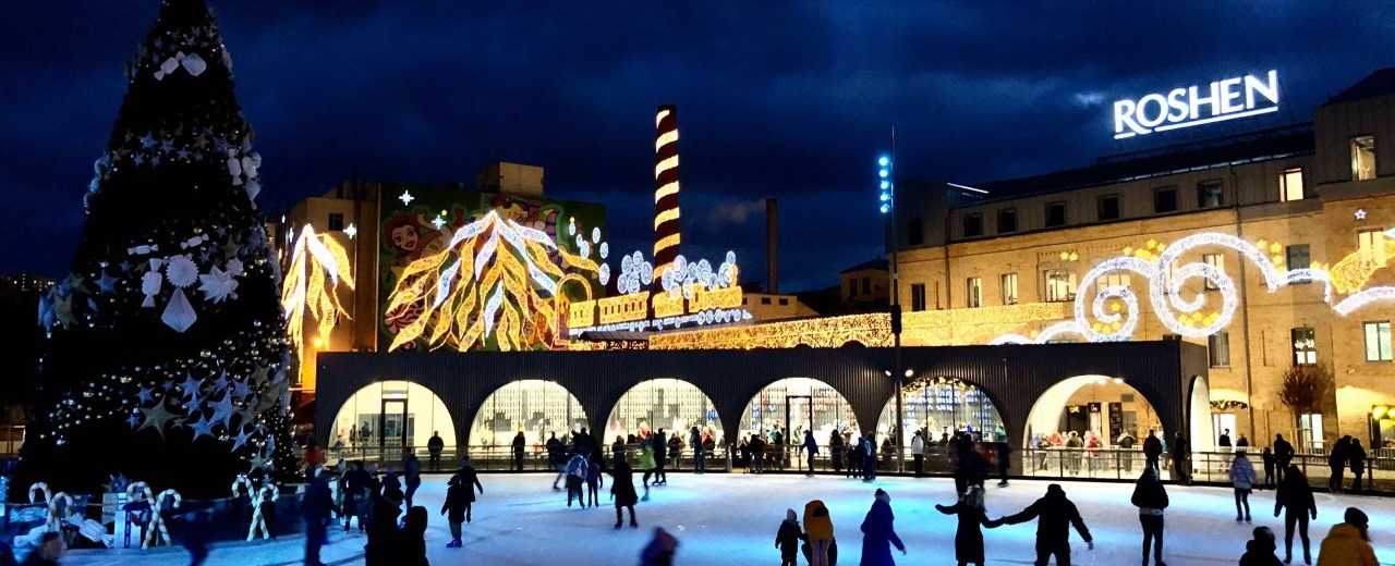 В Киеве, возле фабрики Рошен, расположилось Roshen Winter Village, где красуется новогодняя 15 метровая елка, ярмарок с лучшими фуд-кортами и большой открытый каток. Он подсвечивается разноцветными фонариками и сопровождается светомузыкальным шоу.