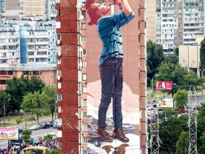 У австралийца Финтана Мэджи (Fintan Magee) это далеко не первая работа на киевских стенах. Мы уже рассказывали о шедеврах стрит-арта его авторства: "Изменение климата", "Гимнастка" и "Человек с оленем".