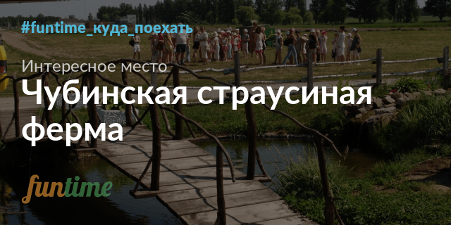 Расположилась ферма возле села Чубинское - отсюда и название. Территория фермы занимает довольно большой участок земли, поэтому здесь нашлось место для самых разных развлечений. Чубинские страусы уже привыкли к посетителям и с радостью позволяют себя гладить и кормить - у входа можно купить специальную корзинку, чтобы угостить птицу. Чубинская страусиная ферма окружена лесами - отсюда очень приятная атмосфера, которая заряжает бодростью и позволяет провести на ферме весь день.