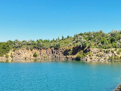 Огромная глубина водоема обеспечивает низкую температуру воды даже в жаркие дни, а яркий бирюзовый цвет формирует эффект живописного горного озера. Берега местами покрыты острыми камнями, что придает местности дикий, даже суровый вид. Из-за крутых спусков и перепадов глубины карьер считается опасным для детей.