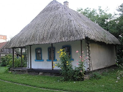 - Интерьер хаты демонстрирует традиционный украинский быт: выбеленные стены, печь, ткацкий станок, мебель, полотенца и иконы.