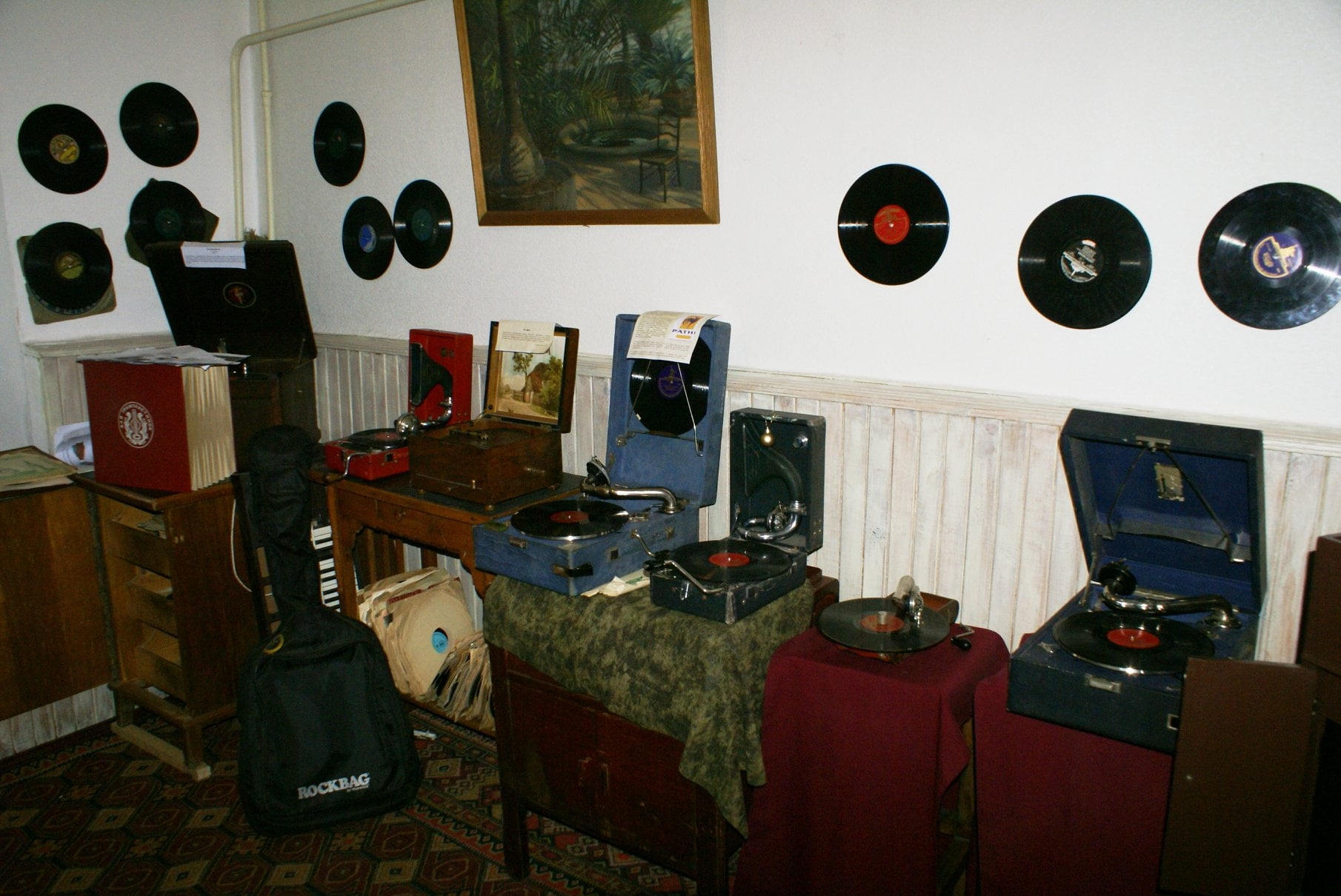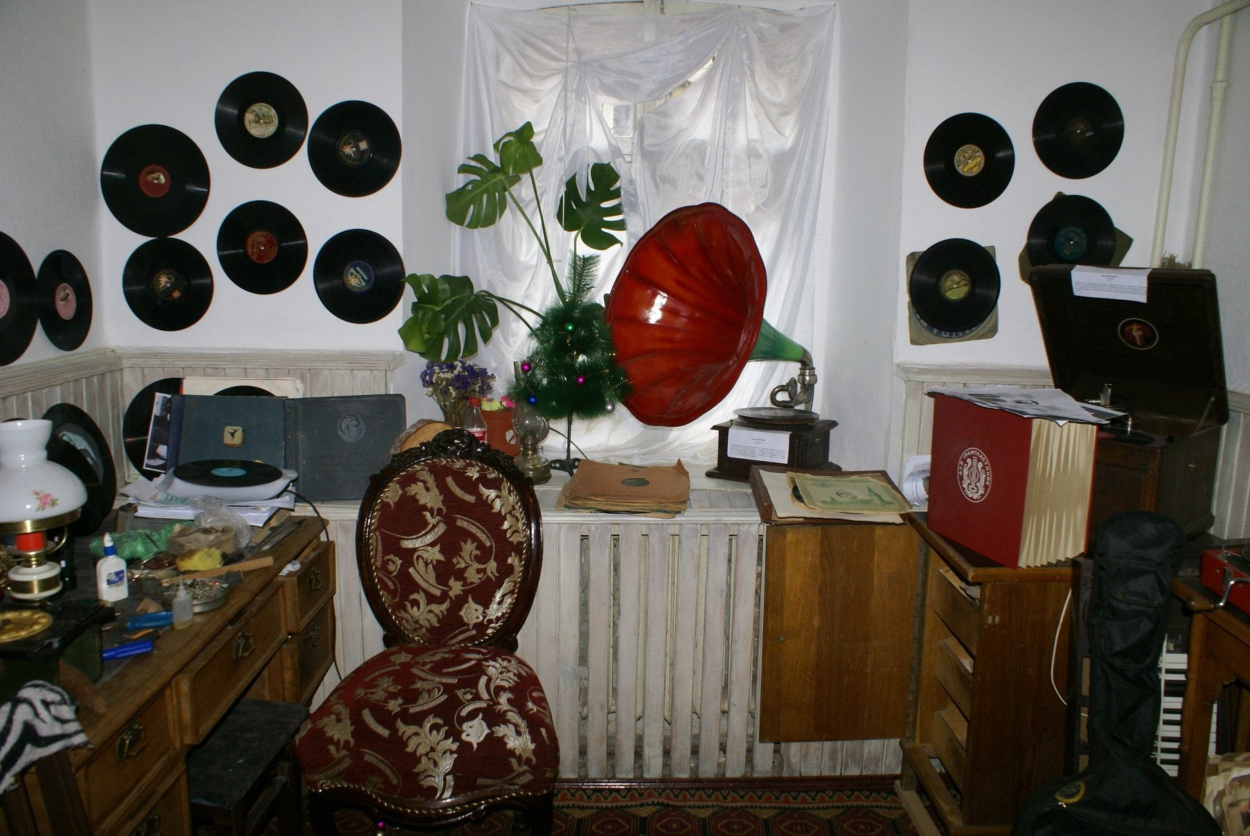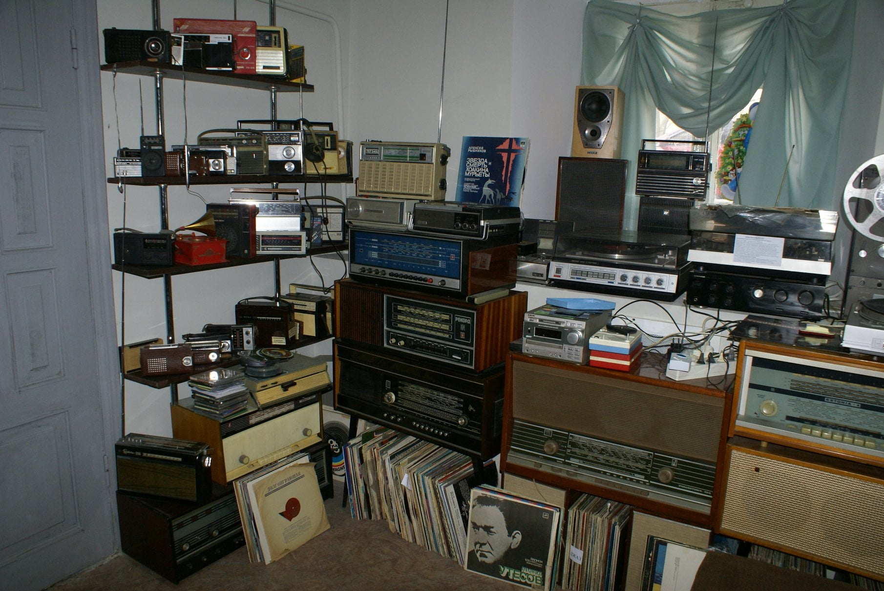 - большая коллекция виниловых пластинок, катушек и кассет.