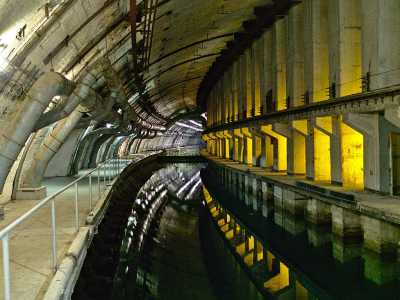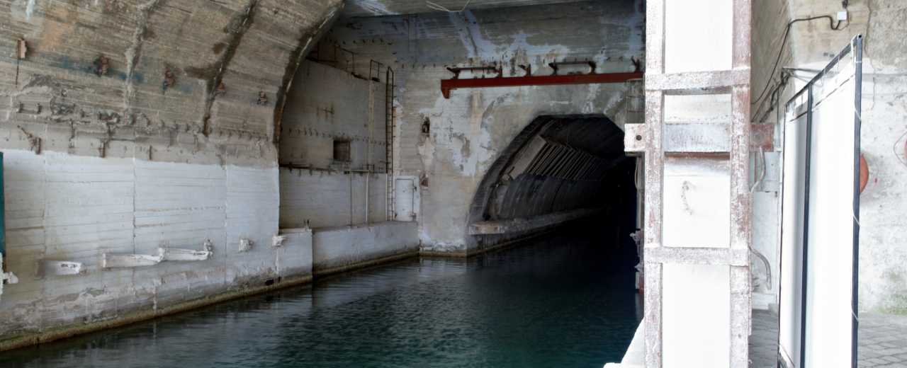 Обычно все экскурсии проводятся по центральному тоннелю, протяженностью около 500 метров. Именно с него начинается основной проходной канал, способный вместить подлодки длиной до 400 метров, шириной не более 22 метров и глубиной до 8 метров. Рядом расположился док для выполнения ремонтных работ нуждающихся в этом судов. Его длина составляет 110 метров. По обе стороны канала размещено несколько цехов и ремонтных мастерских. Особенностью каждого помещения является наличие защищенного входа, оборудованного тяжелыми дверьми с гидрозатвором и противоатомной «начинкой».